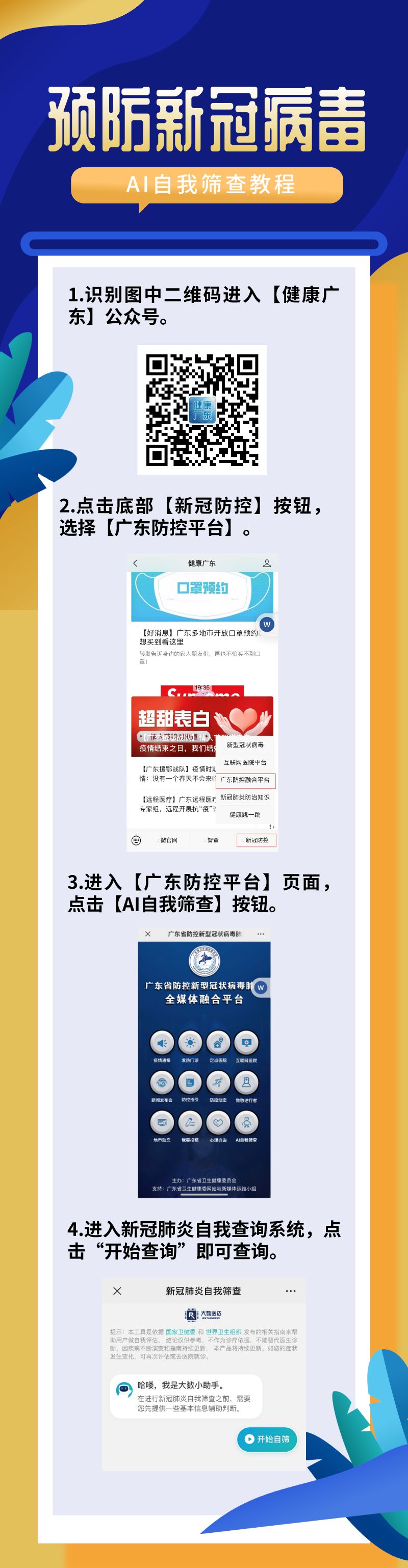 近日,广东省卫生健康委还在政务微信“健康广东”“广东卫生信息”推出了新冠肺炎AI自我筛查模块,公众可在“健康广东”微信公众号“新冠肺炎”菜单中的“广东防控融合平台”点击“AI自我筛查”直达,或在“广东卫生信息”微信公众号找到相同内容。