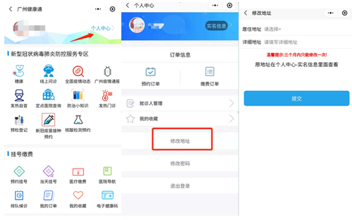 具体操作:点击个人中心--修改地址,(三个月内只能修改一次地址,原地址可在个人中心--实名信息查看),修改地址后回到首页点击“新冠疫苗接种预约”功能进行预约。