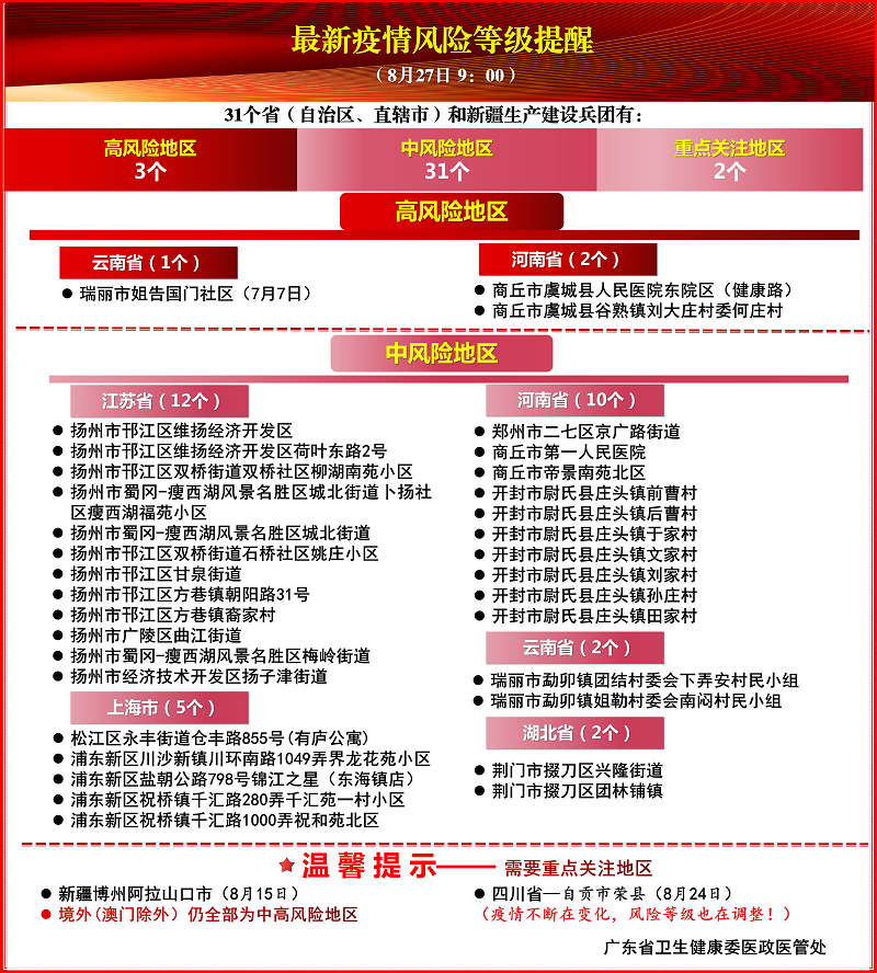 截至8月26日11时,云南德宏州,河南商丘、郑州,江苏扬州,湖北荆门,上海,新疆博州等6省份重点地区管控起始日期来(返)粤人员仍需执行相应健康管理措施。