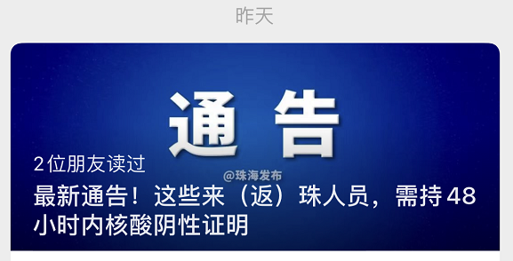 ►珠海市新型冠状病毒肺炎疫情防控指挥部发布最新通告: