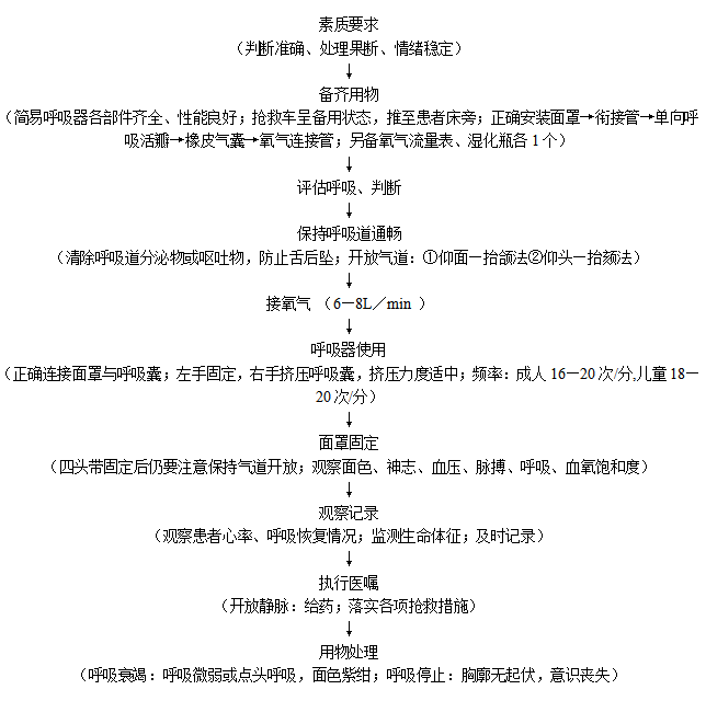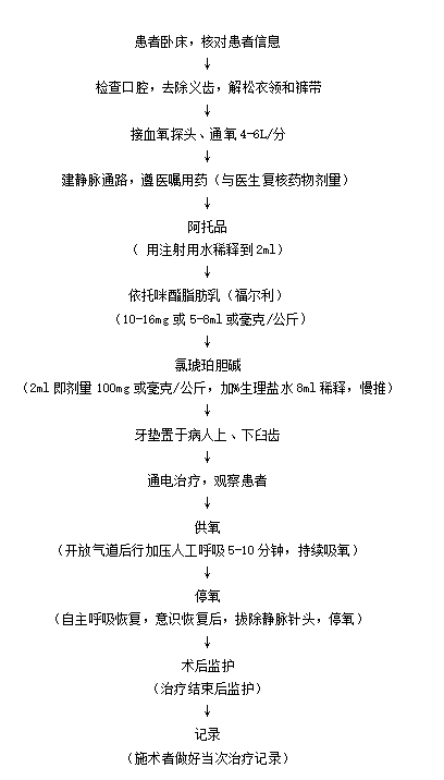 通电结束,局部痉挛仍有发作,开放气道即用活瓣气囊(连接氧气)做加压人工呼吸,评估包括气道通畅、胸廓活动、呼吸音听诊等,一般为5-10分钟,直至自主呼吸恢复,意识恢复后,拔除静脉针头。