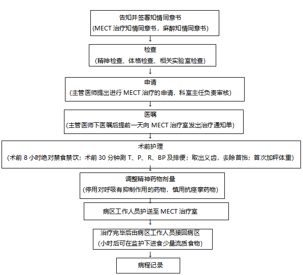 1、告知:签署知情同意书(MECT治疗知情同意书,麻醉知情同意书)。