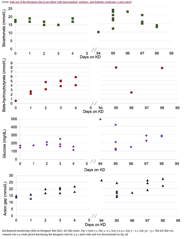先证者是在妊娠37周时通过正常的自然阴道分娩出生的,此前有简单的产前病史以及妊娠和分娩。她是一对非血缘关系夫妇的第二个孩子,她的哥哥很健康,发育正常。出生时,生长参数正常(体重2.715公斤,身高50厘米),除了头部大小在第8个百分位数(图)。1). 当她因新发癫痫发作被送往急诊科时,她的新生儿筛查检查和发育在头 2 个月是正常的,并在脑电图 (EEG) 上发现频繁的多发局灶性癫痫发作。磁共振成像显示没有实质信号异常,但确实显示蛛网膜下腔和沿颞凸的双侧小硬膜下湿疹。她的癫痫发作演变为包括婴儿痉挛症和局灶性癫痫发作,脑电图以弥漫性脑病、多发局灶性癫痫样放电和痉挛发作时的高度节律失常为显著特征——与癫痫性脑病一致。作为诊断检查的一部分,多基因癫痫小组被送去(补充表)报告了两种IER3IP1中意义不确定的变异(NM_016097.4)。第一种是c.239T > G(p.Leu80*),是新颖的,预计会因无义介导的衰变而导致蛋白质截断或单倍体功能不全导致功能丧失。第二个,c.2T>A(引发密码子),可能会影响转录,因为它会影响IER3IP1基因的起始密码子。两种变异均符合美国医学遗传学会的致病性标准[5]。根据照顾先证者的遗传学团队的临床建议,对未受影响的父母进行测序,显示c.239T>G(p.Leu80*)的父系遗传和c.2T>A的母系遗传。 Clinical course of proband from birth to 14 months of life 4 个月大时,她因婴儿痉挛症再次入院,并开始服用大剂量类固醇。在此期间,她的血糖从入院前的92毫克/分升增加到出院时的112-241毫克/分升。在服用类固醇期间,她的父母报告说她的一般运动、眼动追踪和痉挛频率都有所改善。出院一周后,由于持续性高血糖(>298 mg/dL)而停用类固醇,尽管使用了多种抗癫痫药物,但癫痫发作频率、持续时间和强度增加。因此,她在 400.4 个月大时再次入院,重新开始类固醇和胰岛素启动,因为她的血糖水平增加到 5-200 mg/dL,与 MEDS 中观察到的 β 细胞功能障碍一致。血糖水平在400.0-35.0单位/ kg / d的胰岛素治疗中恢复正常。她的血糖值通过间歇性扫描连续血糖监测(isCGM)进行监测。 9个月大时,她因治疗难治性癫痫而入院启动KD。入院实验室(最后一次基础剂量后 0 小时)显示轻度酸中毒 [β-羟基丁酸 (BHB) 6.17mmol/L,碳酸氢盐 15mmol/L,阴离子间隙 (AG) 1mmol/L]。决定以比标准协议慢的速度推进KD比率,从1:0的比率开始。鉴于当时胰岛素的每日总剂量较低(01.12单位/千克/天),我们保留了她的胰岛素。每四小时评估一次血糖,每15小时测量一次评估酸中毒的化学小组。目标碳酸氢盐水平≥6mmol/L,这是糖尿病酮症酸中毒(DKA)的诊断标准[3]。由于缺乏针对川崎病和胰岛素减少型糖尿病的既定指南,安全的BHB目标不太明确,因此我们将初始目标BHB水平设定为<6mmol/L,并仔细观察[<>]。 通过出院,她的KD比在三天内优化至2.5:1,而她的生物化学没有显着变化(图)。2). 她每晚重新开始服用甘精胰岛素 0.5 单位,以促进每日安全期以限制生酮。家庭监测包括每日两次毛细血管酮测量和isCGM。出院后不久,由于低血糖(2-1mg / dL),该比率降至60:70。出院一个月后,甘精胰岛素增加到0.5单位,每日两次,由于高血糖,KD比增加到3:1。通过这些变化,她的反应能力和与家人的参与度有所改善,酮体在 3-6 mmol/L 的目标范围内血糖正常。 川崎病开始三个月后,她出现四天的呕吐、腹泻、多尿、高血糖(isCGM 300-400 mg/dL)和酮体增加(8-9mmol/L)。家人联系了她的儿科医生,但由于湿尿布数量众多而感到放心。由于高血糖,甘精胰岛素的逐步增加。由于对胰岛素变化缺乏反应,症状逐渐恶化(眼睛凹陷,嘴唇干裂和临床脱水),她被送往急诊室。发现她患有高渗性 DKA(pH 7.2、尿素 40 mg/dL 和 Na 170mEq/L),需要进行大量液体复苏和胰岛素滴注含葡萄糖的液体。在这个关键时期,试图保持酮症没有被优先考虑。在她的酮症消退后,家人强烈赞成重新开始饮食(比例为3:1)。发作一个月后,她患上了第二种病毒性疾病,导致DKA。尽管父母报告了川崎病的临床益处,但在两次DKA发作后停止了饮食。患者在 4 周内停止饮食,每周将比例降低 0.5:1。 在她最近的一次门诊就诊中,她继续通过胰岛素治疗恢复血糖正常,并且没有伴有临时病毒性疾病的严重酸中毒。她继续有明显的难治性癫痫痉挛,并且与开始川崎病前一样警觉性下降。 我们介绍了一个婴儿患有MEDS的病例,这是由于使用类固醇和川崎病治疗的IER3IP1和难治性癫痫性脑病中的两种双等位基因致病变异。她的管理因在实现用于治疗目的的酮症和避免可能导致 DKA、脑水肿和其他不良并发症的严重酮症之间的微妙平衡而变得复杂。在她的临床管理中,困难在于酮类预防癫痫发作的治疗效果是引起DKA途径的基础[7]。 对于酮体的产生(无论是为了控制癫痫发作而治疗还是在DKA情况下的病理性),有三种主要机制。首先,减少碳水化合物摄入量和增加脂肪摄入量导致脂肪成为主要燃料来源(即川崎病)。其次,诱导饥饿状态需要利用代谢储存(即脂肪)。第三,胰岛素减少状态导致无法抑制脂肪分解,导致酮的产生。无论酮体产生的机制如何,酮症伴有严重酸中毒可导致严重的临床并发症,包括脑水肿。在开始川崎病时,我们的患者的胰岛素需求非常低,仅为0.1单位/千克/天。鉴于这种低胰岛素需求加上川崎病碳水化合物的必要限制,她被认为有正常血糖 DKA 的风险。此外,治疗性川崎病的开始和维持需要产生酮体,因此需